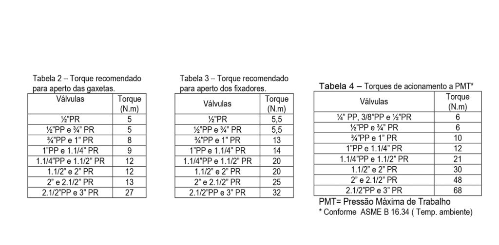 6.2 Rotina Trimestral ou a cada 100 ciclos: Reapertar a porca da gaxeta até o torque recomendado na tabela 2. Proceder cuidadosamente a inspeção visual com o objetivo de detectar possíveis vazamentos por poros ou trincas no corpo e tampa, possíveis vazamentos pela haste, pela união do corpo e tampa e pelas conexões com as linhas de processo. Caso isso ocorra, reapertar os fixadores conforme torque recomendado na tabela 3.
